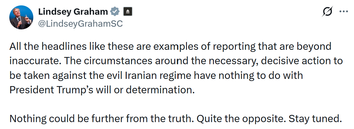 “All the headlines like these are examples of reporting that are beyond inaccurate,” Graham wrote on X, insisting that the president’s resolve remains unchanged. “The circumstances around the necessary, decisive action to be taken against the evil Iranian regime have nothing to do with President Trump’s will or determination,” he added, ending with: “Stay tuned.”