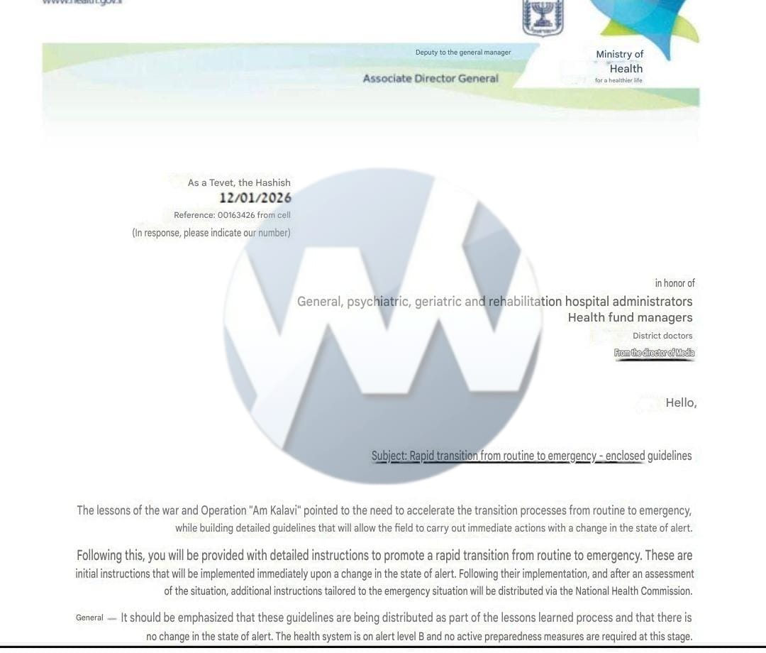 Israel’s Health Ministry circulated an updated emergency readiness document to hospital directors, health funds and Magen David Adom due to ongoing unrest in Iran and the risk of regional escalation.