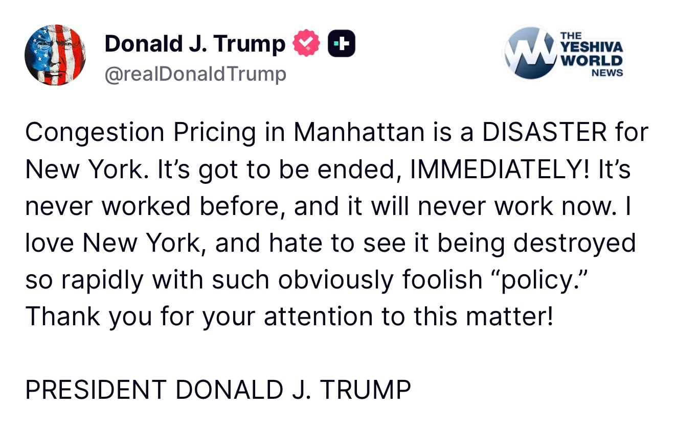 TRUMP: Congestion pricing in Manhattan is a DISASTER for New York. It’s got to be ended, IMMEDIATELY! It’s never worked before, and will never work now. I love New York, and hate to see it being destroyed so rapidly with such obviously foolish “policy.” Thank you for your attention to this matter!