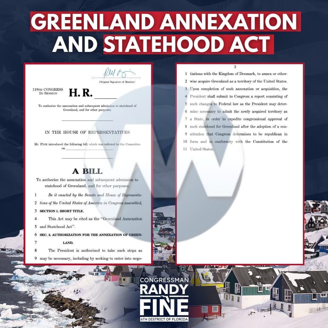 Republican Rep. Randy Fine has introduced legislation calling for the annexation of Greenland and its admission as a U.S. state, arguing it is a vital national security asset for countering China and Russia in the Arctic.