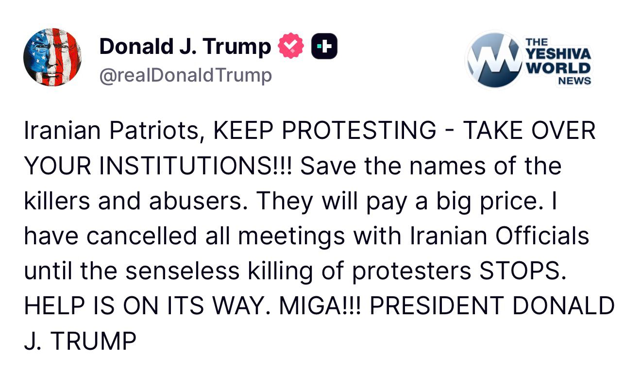 🚨 TRUMP: Iranian Patriots, KEEP PROTESTING – TAKE OVER YOUR INSTITUTIONS!!! Save the names of the killers and abusers. They will pay a big price. I have canceled all meetings with Iranian officials until the senseless killing of protester. STOPS. HELP IS ON THE WAY. MIGA!!! PRESIDENT DONALD J. TRUMP