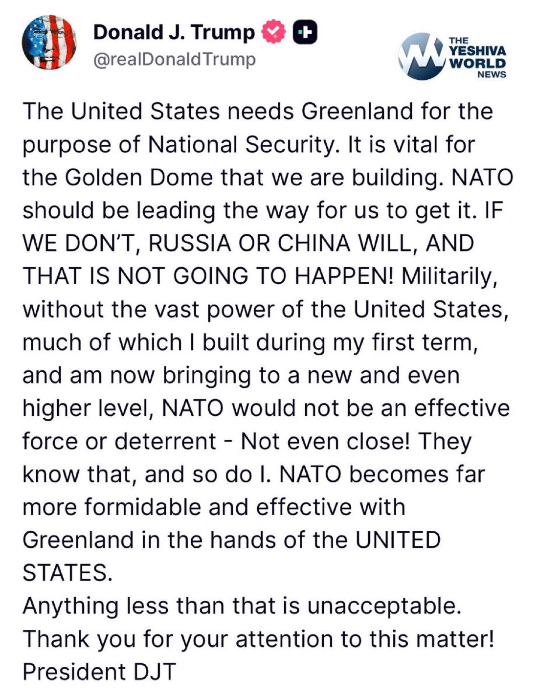 TRUMP: The United States needs Greenland for the purpose of national security. It is vital for the golden dome that we are building. NATO should be leading the way for us to get it. IF WE DON’T, RUSSIA OR CHINA WILL, AND THAT IS NOT GOING TO HAPPEN!