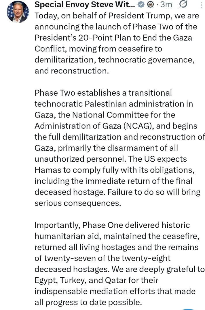 🚨 BREAKING: U.S. Special Envoy Steve Witkoff officially announced the launch of Phase Two of President Trump’s Israel-Gaza peace plan, moving Israel and Hamas from a ceasefire phase into demilitarization, technocratic governance, and reconstruction in Gaza.