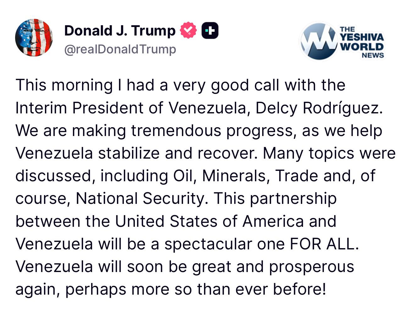 Trump held call with Interim President of Venezuela, Delcy Rodriguez