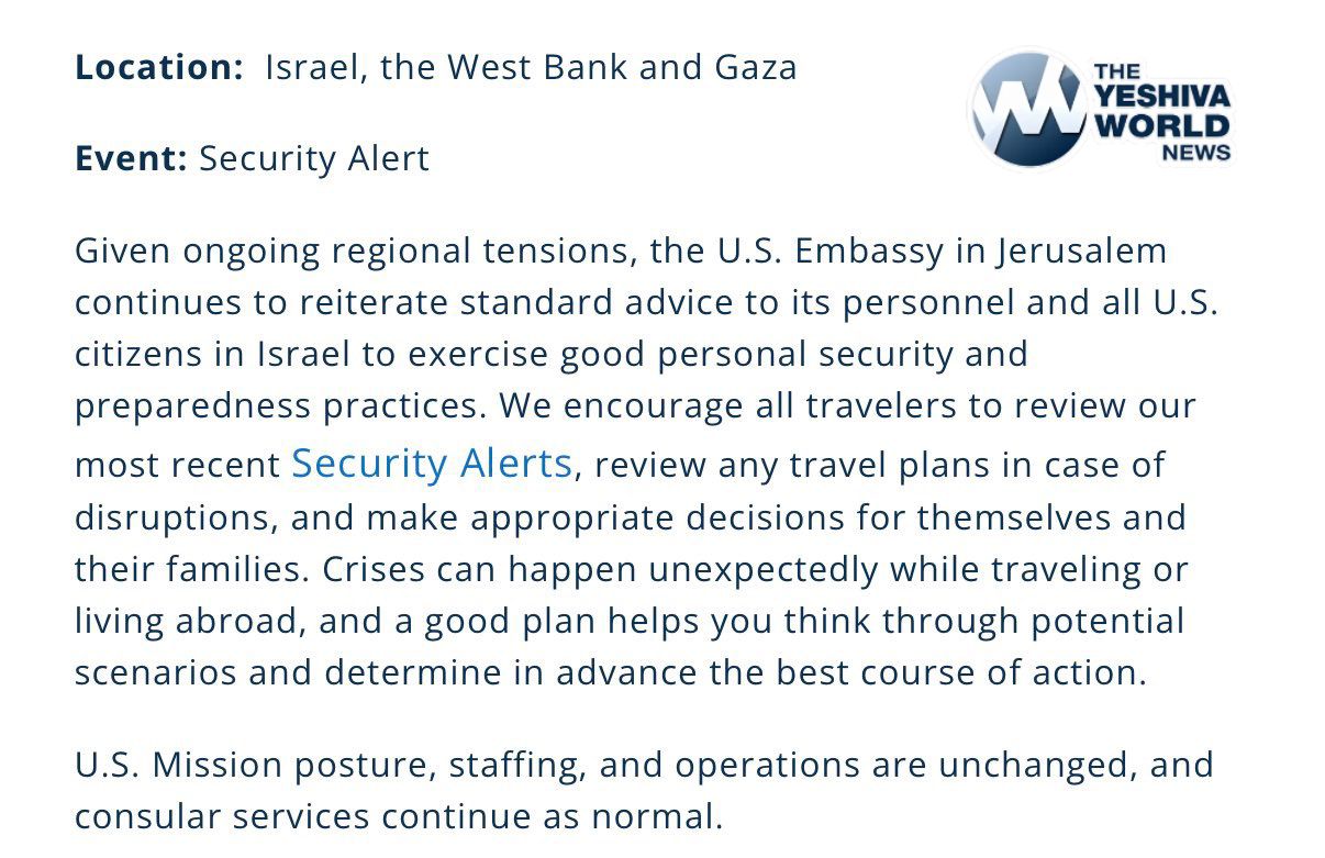 🚨 BREAKING – US Embassy in Jerusalem issues security alert saying that “given ongoing regional tensions” US citizens should “review any travel plans in case of disruptions, and make appropriate decisions for themselves and their families.