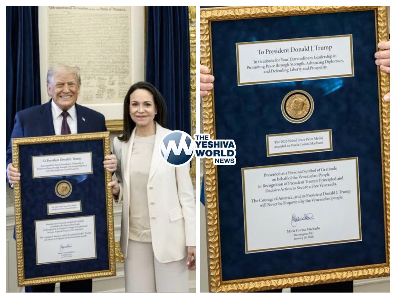 President Trump with Nobel Peace Prize, given to him by Venezuelan opposition leader Maria Corina Machado.