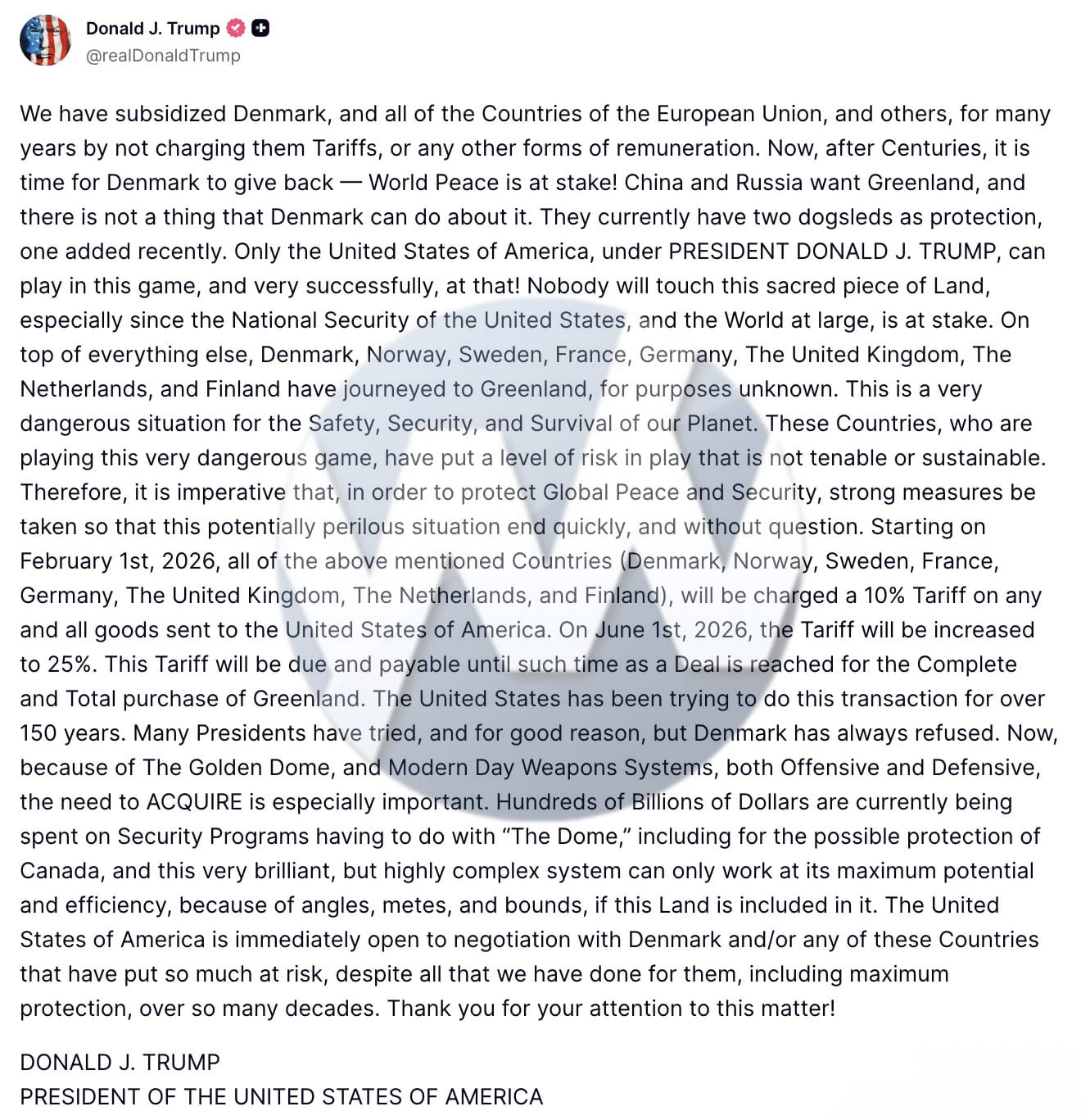 Trump: NATO members to face tariffs increasing to 25% until a Greenland purchase deal is struck
